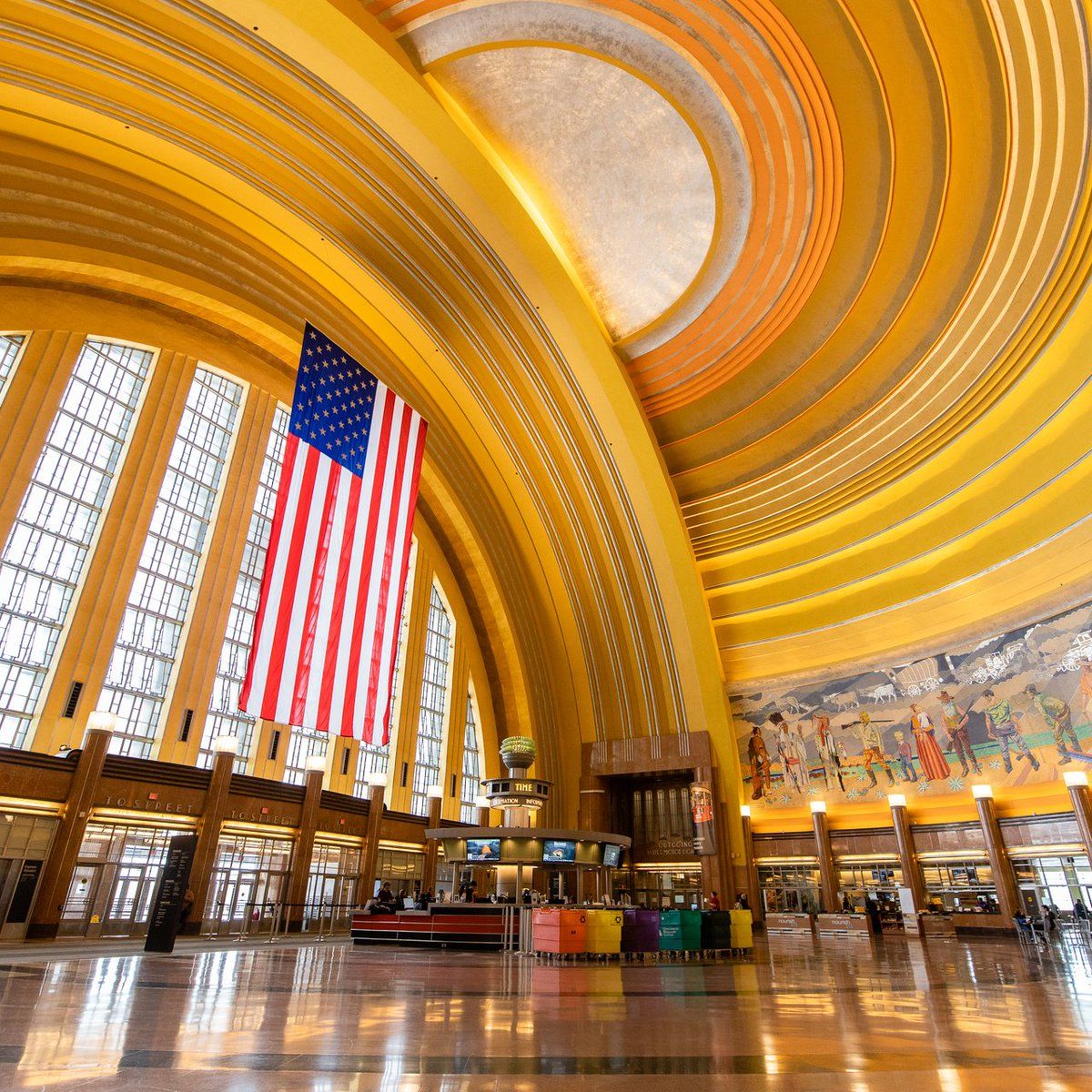 The boldest Art Deco design was the one in Cincinnati. Its ten-story, half-domed entrance is adorned all the way around with mural mosaics that tell the history of Cincinnati.